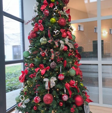 Bordeaux, felrode en zilverkleurige kerstballen zijn de basis. De ijsdruppels, kerststerren, besneeuwde en zilverkleurige accessoires en parels zorgen voor een feestelijke uitstraling